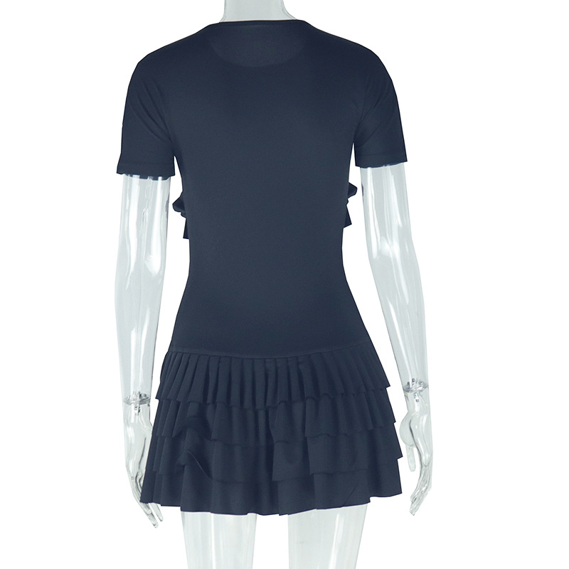 Solid Color Tight Sweet Fresh Pleated Skirt Short Sleeve round Neck Short Dress