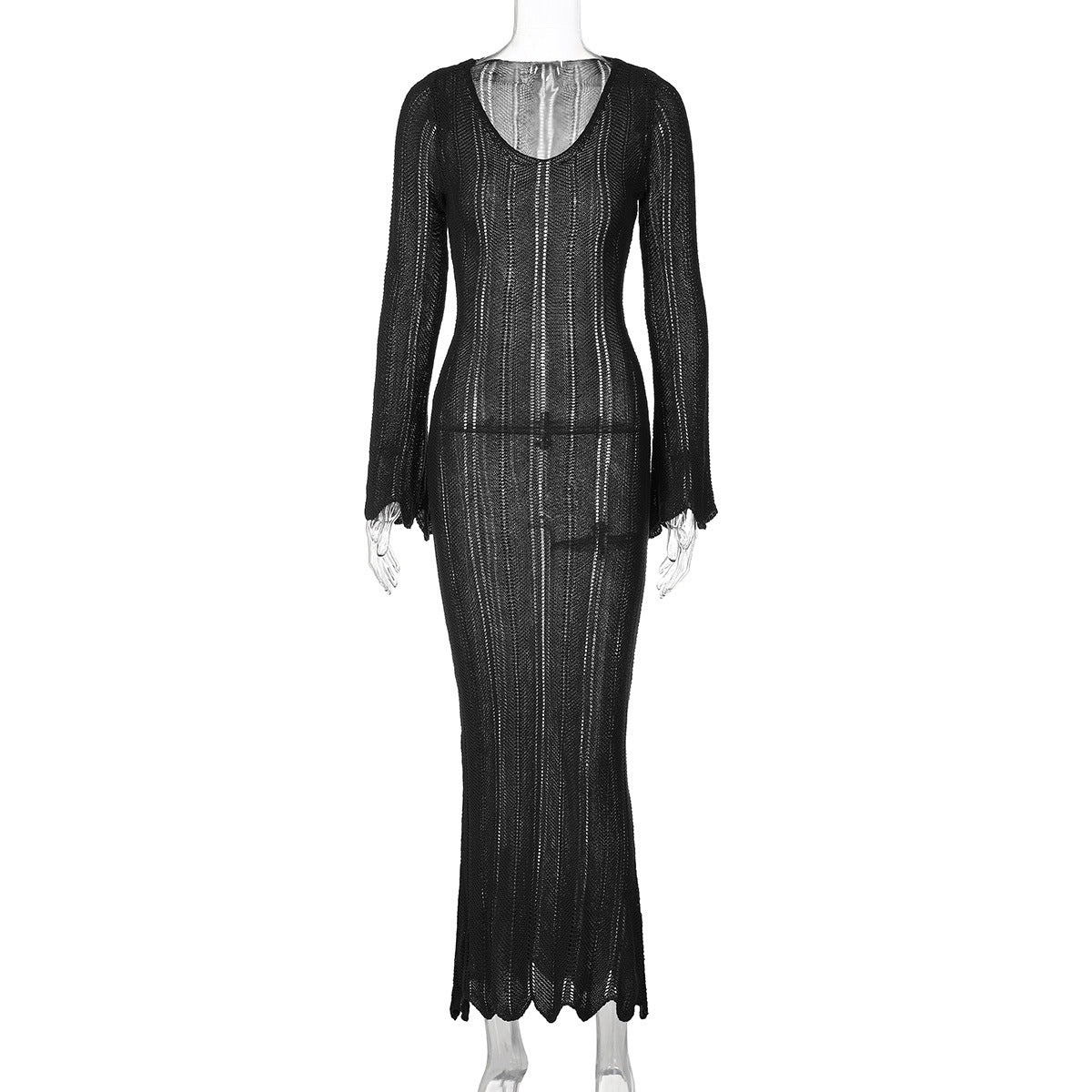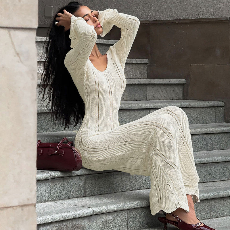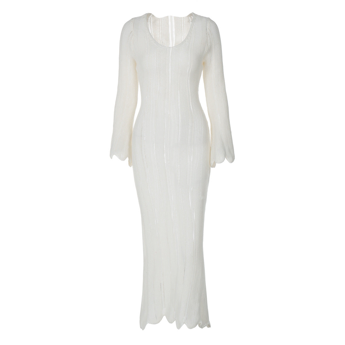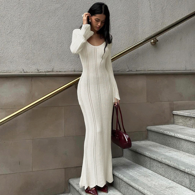Solid Color Woolen Dress Long Sleeve U Collar Slim Fit Dress