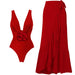 Solid Red Flower Swim Suit Deep V Bodysuit