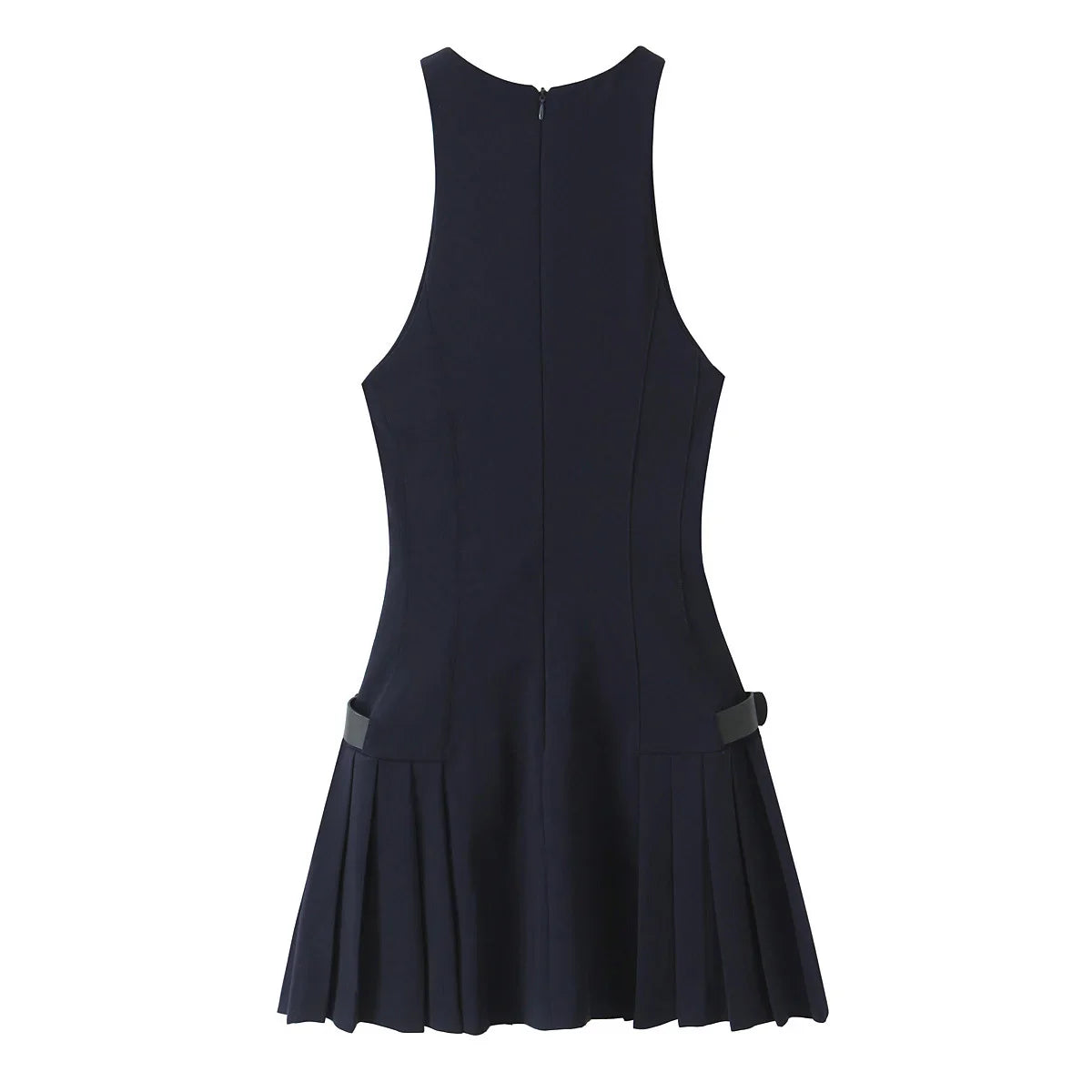 Solid Sleeveless Back Zipper Belt Pleated Dress