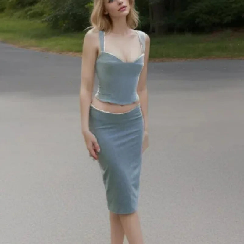 Spliced Lace Top Low Waist Midi Skirt Suits