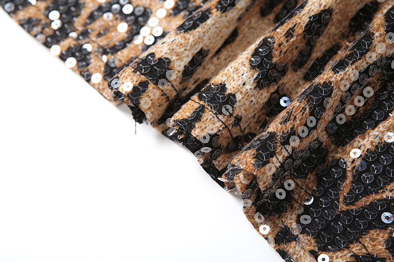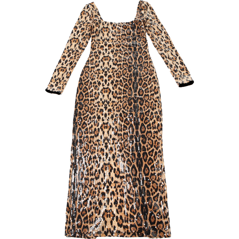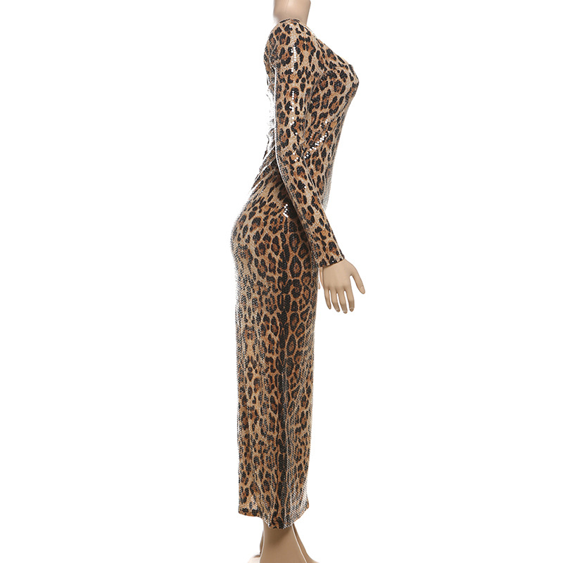 Square Collar Leopard Sequ Back Slit Long Sheath Dress