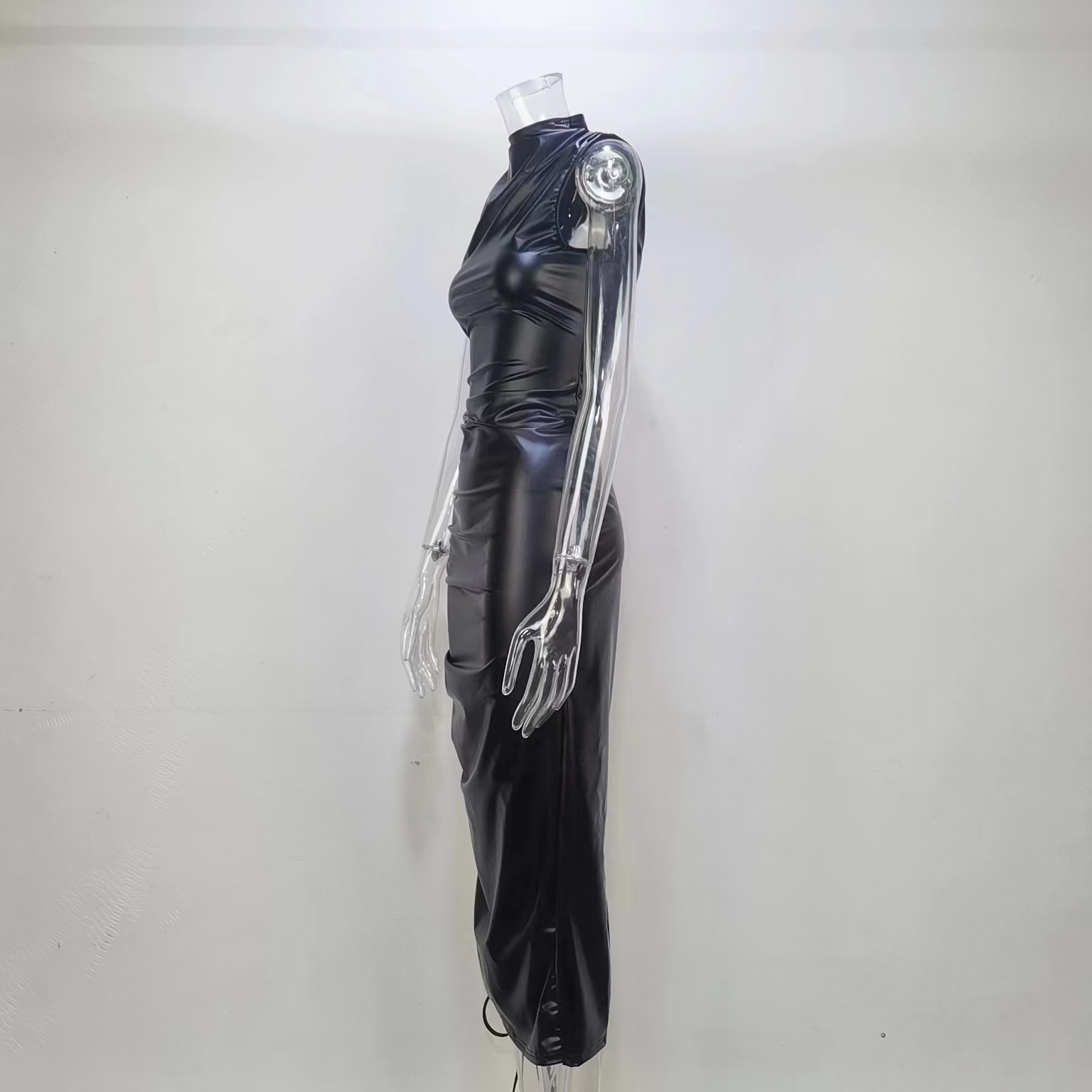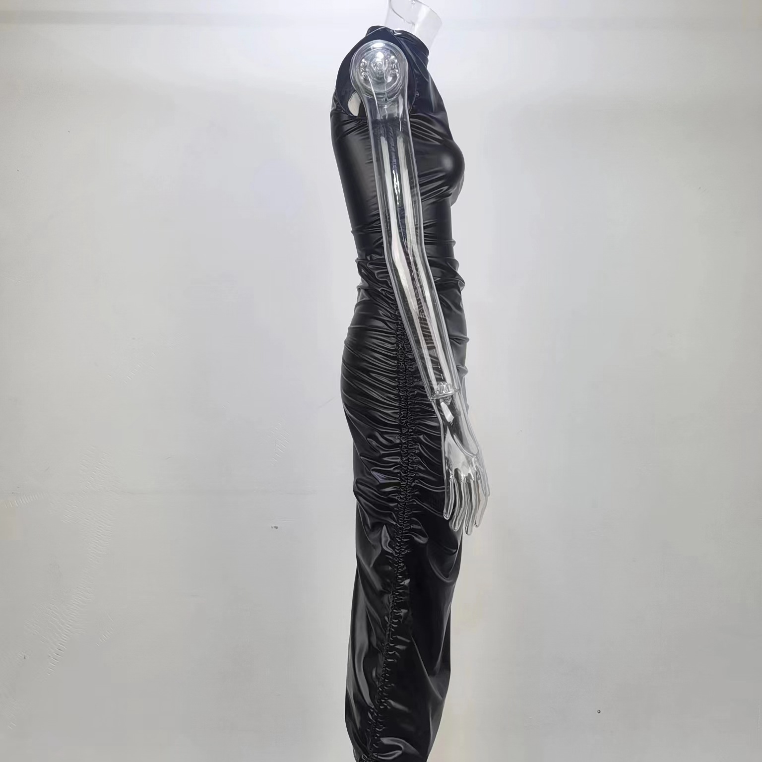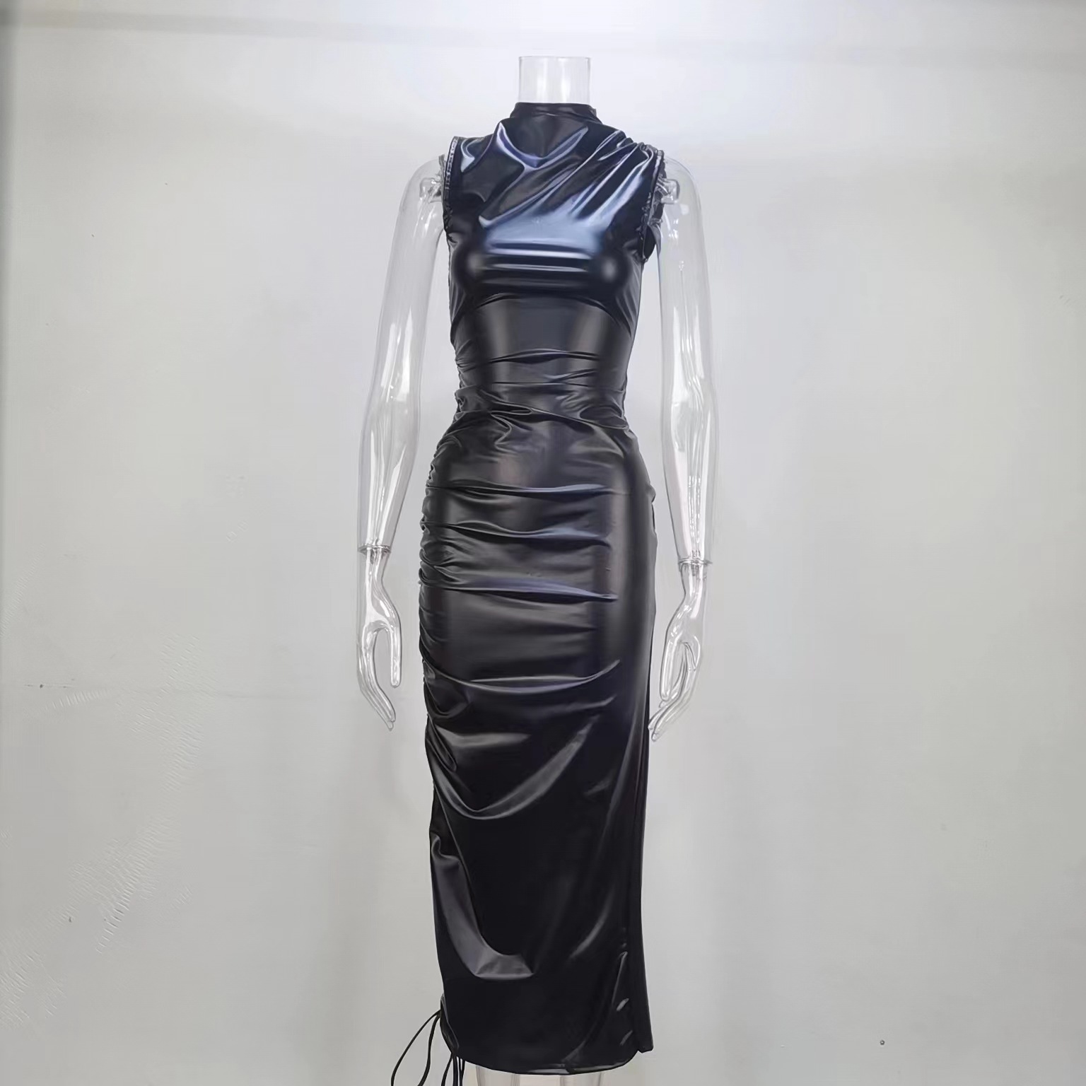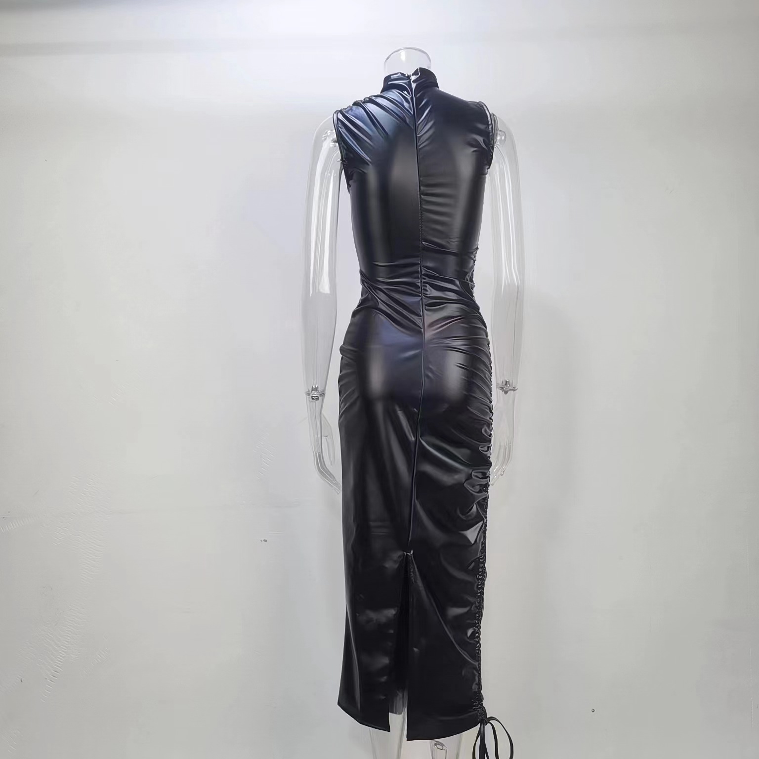 StCollar Sleeveless Mid Length Drawstring Faux Leather Dress