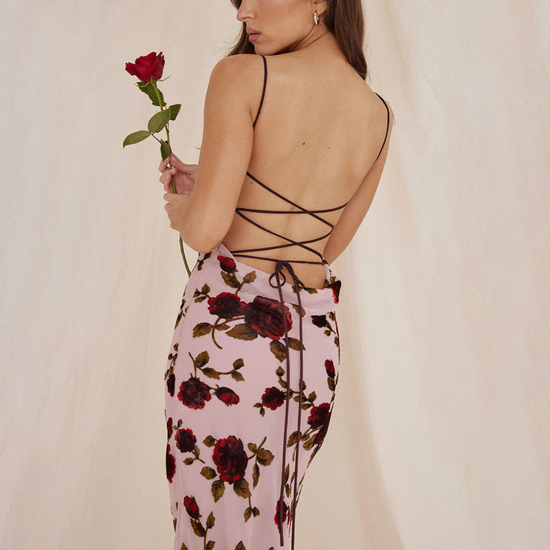 Strap Backless Rose Printed Dress Vacation Slim Fit Lace up Dress