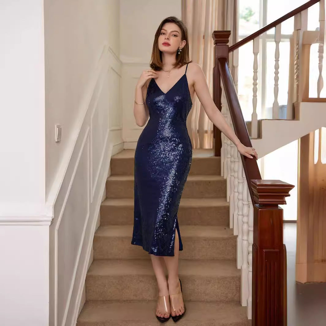 Strap Elegant Dress Sequined V neck High Waist Short Dress