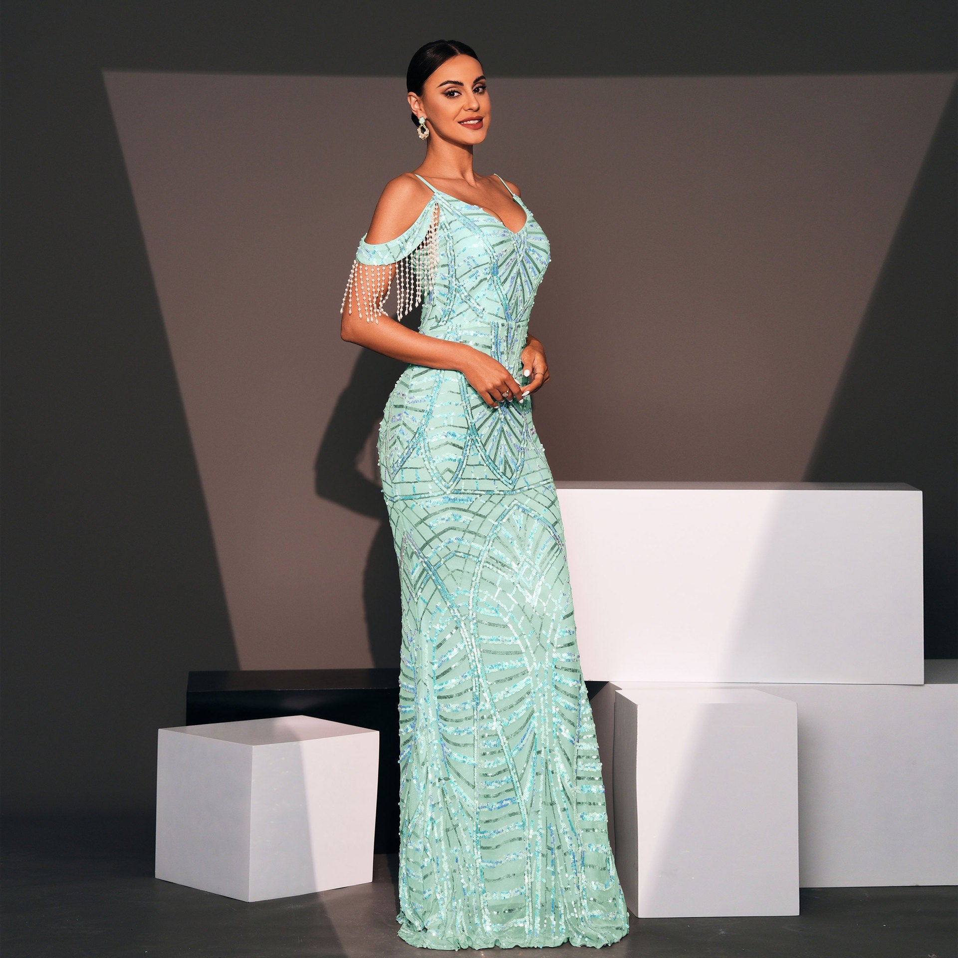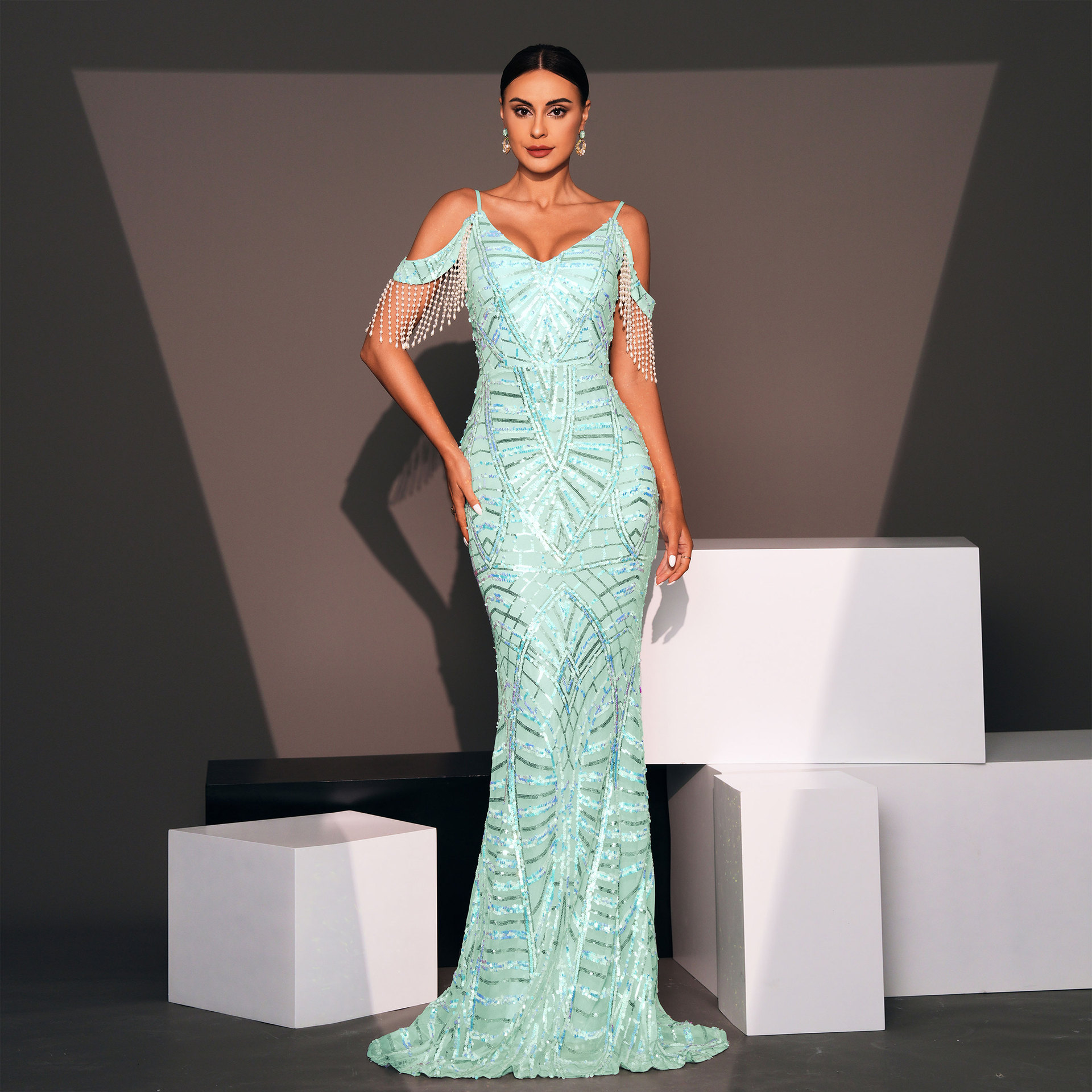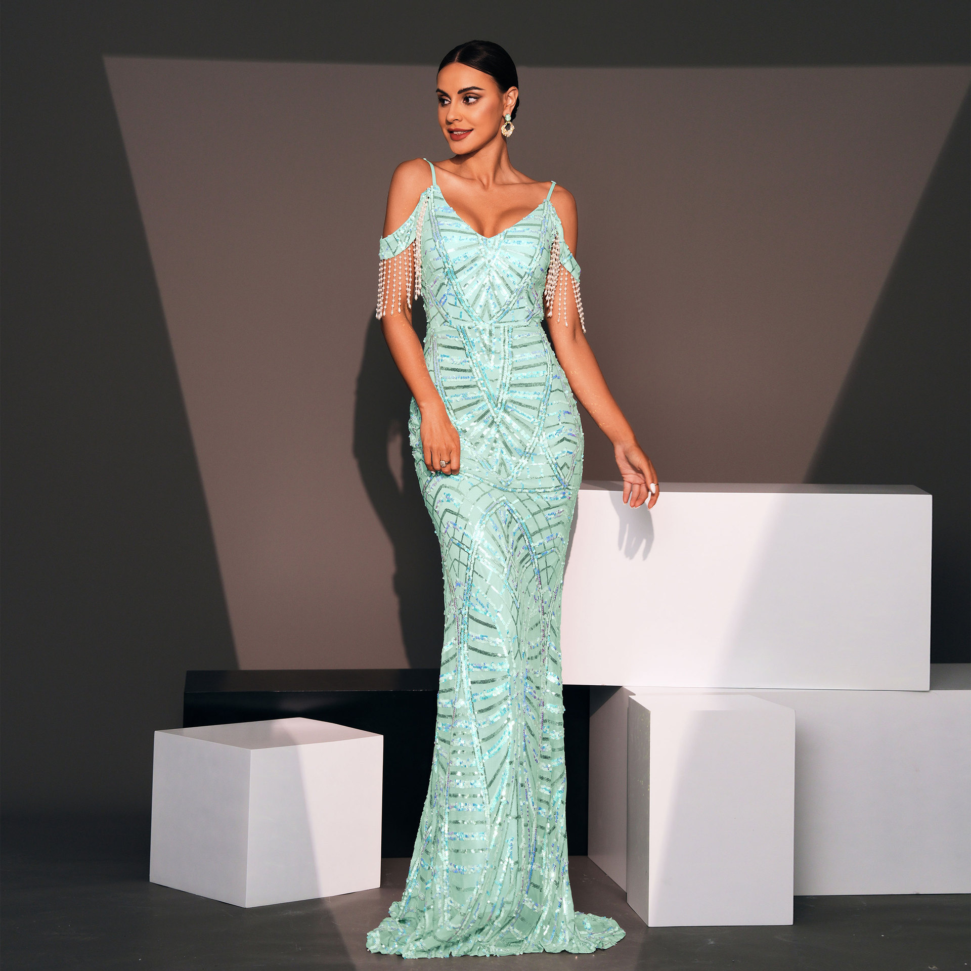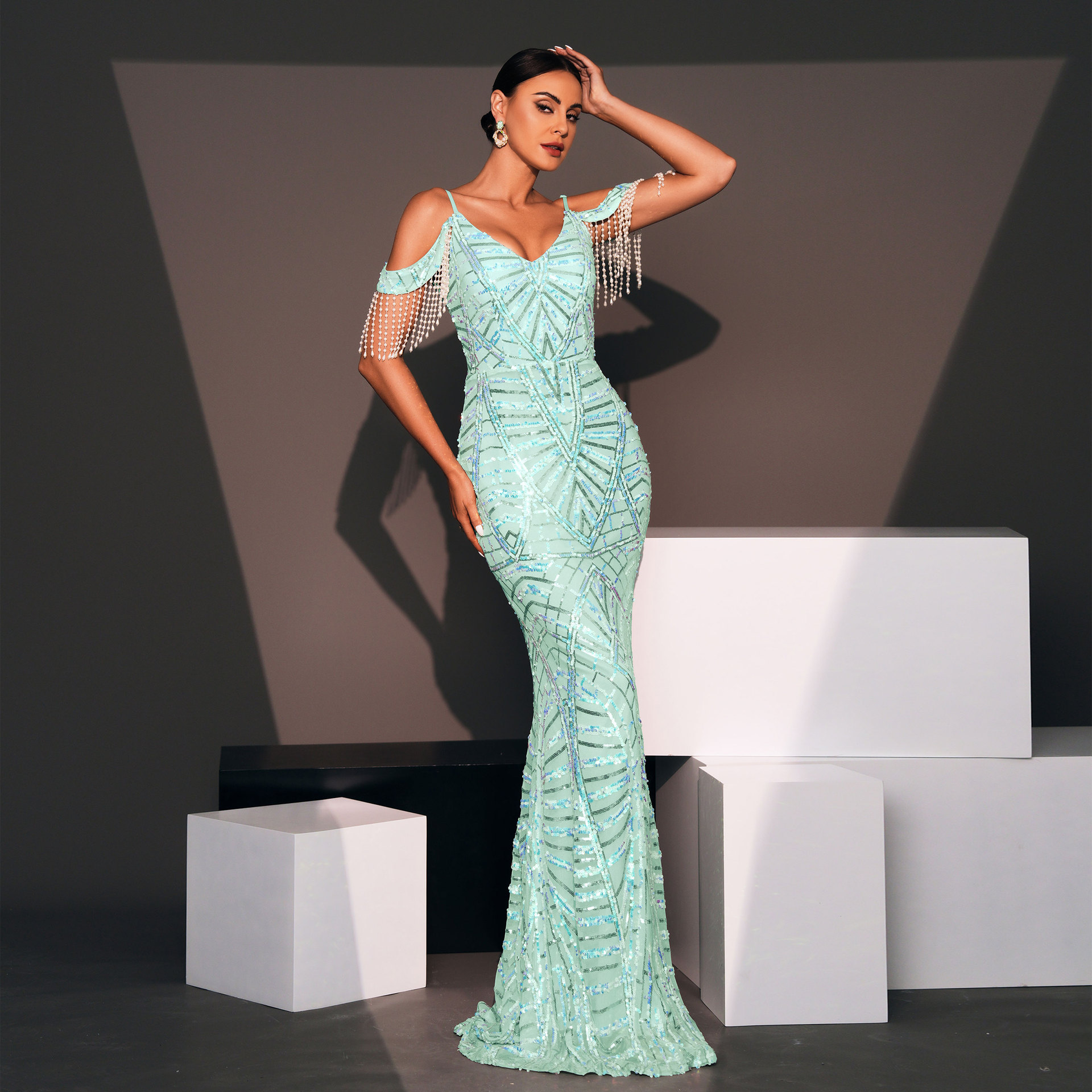 Strap Elegant V Neck Long Sequined Cocktail Fishtail Evening Dress Bridesmaid Dress