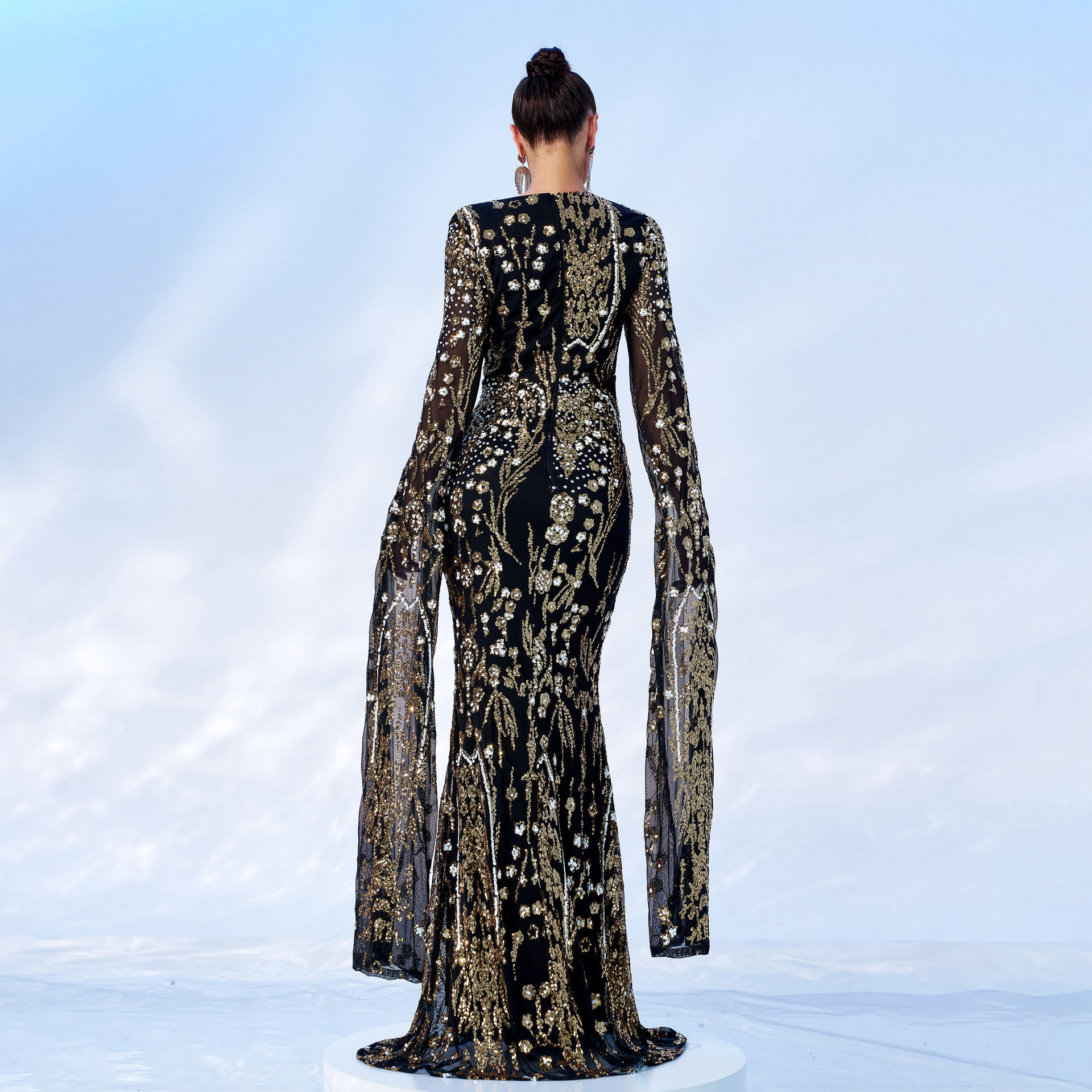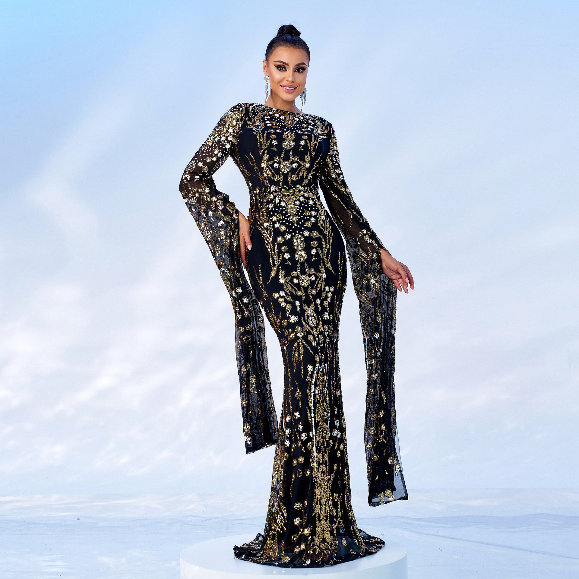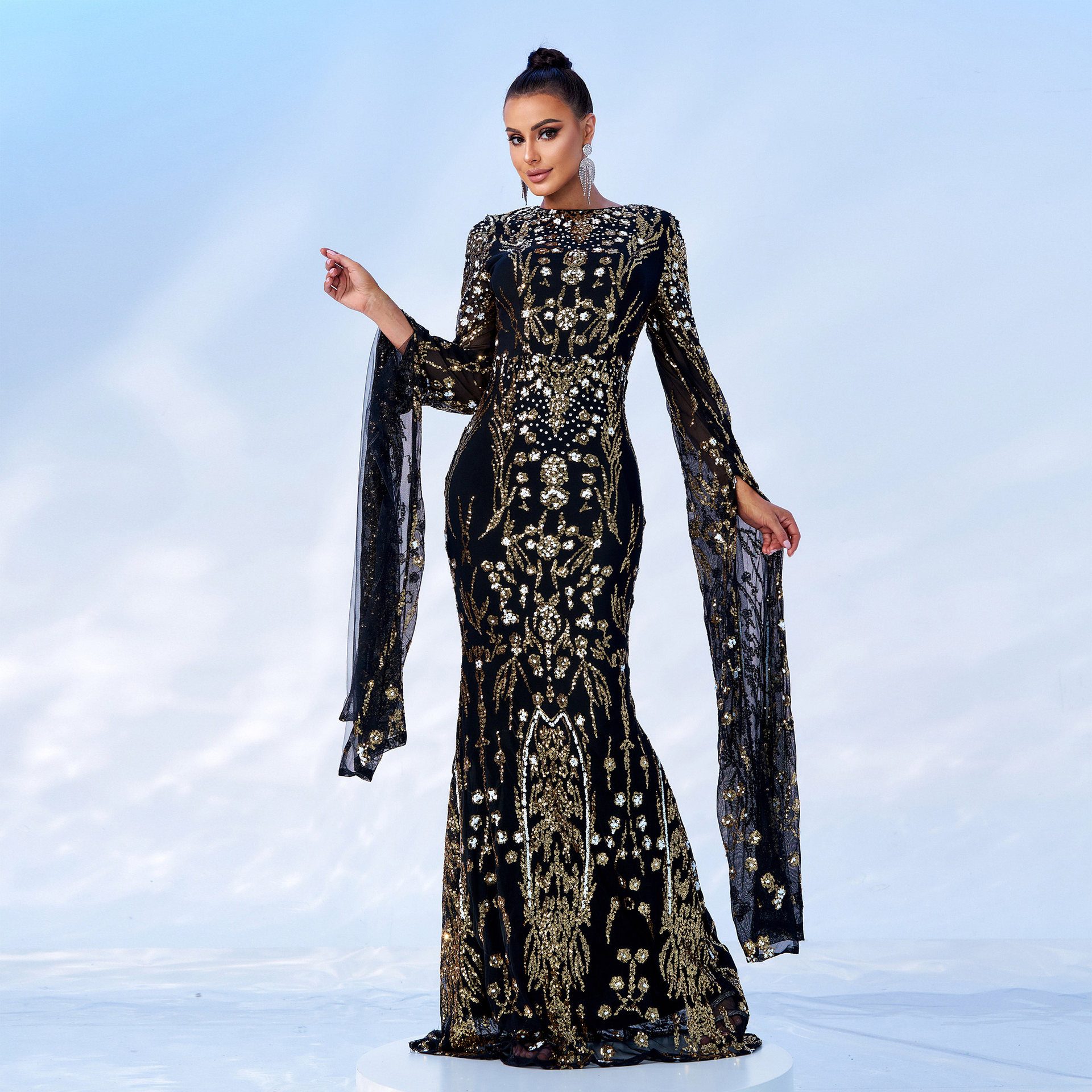 Super Long Sleeve Crew Neck Slim Long Sequined Cocktail Evening Dress Bridesmaid Dress