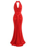 Swinging Collar Backless Pleated Red Stain Maxi Dress
