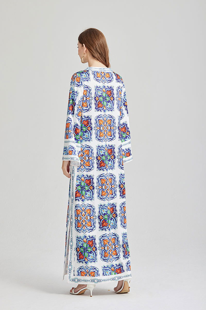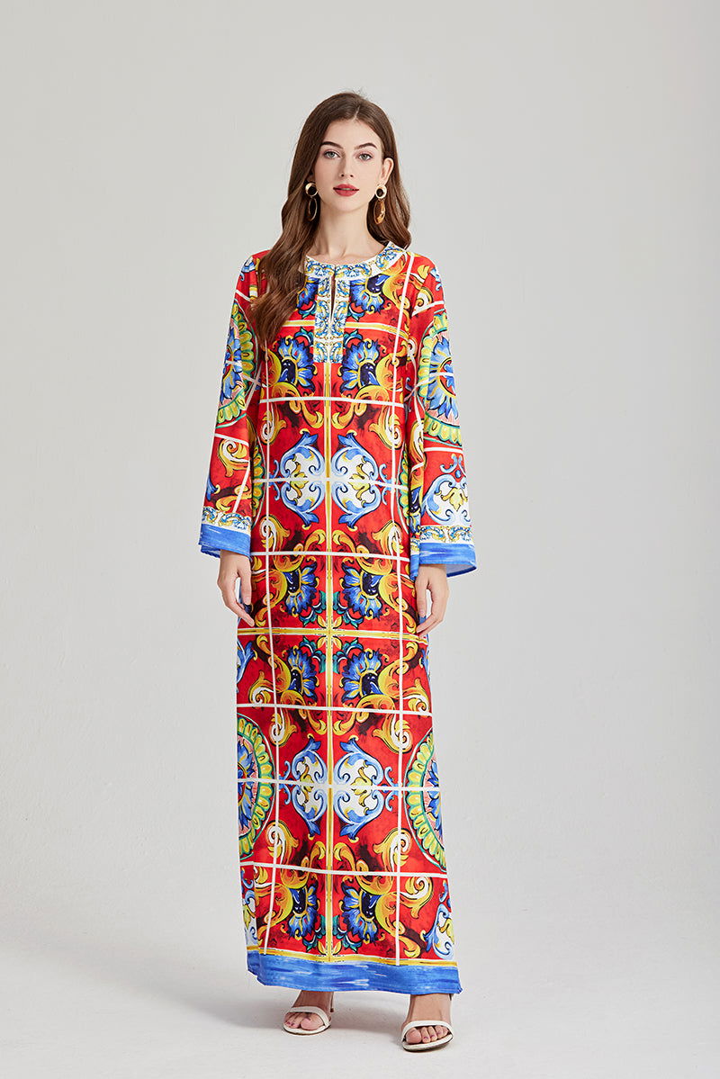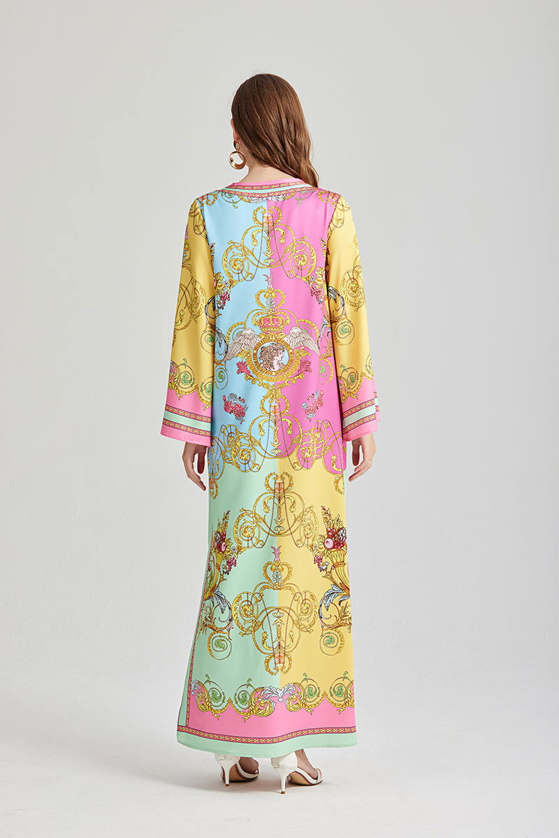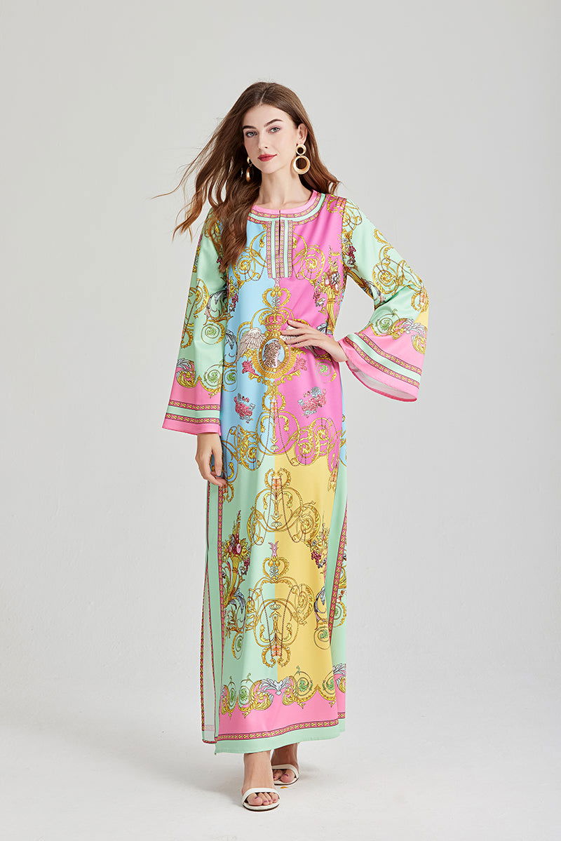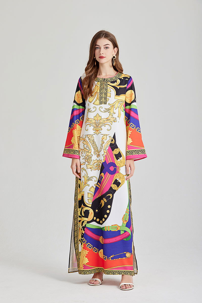 Vintage Printed Round Neck Split Long Sleeve Personalized dress