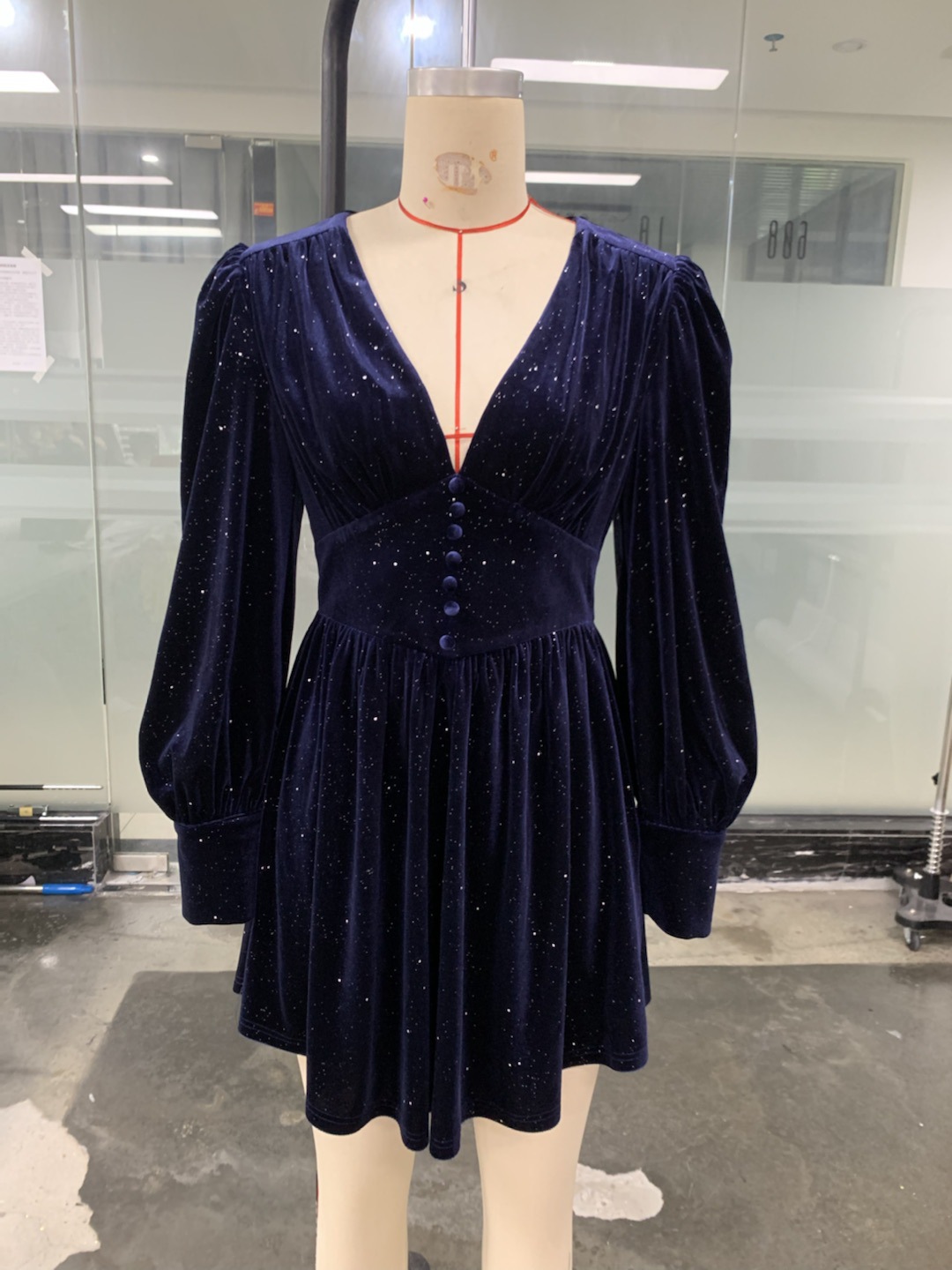 Waist Tight Large V neck Long Sleeve Slim Fit Socialite Elegant Velvet Evening Dress